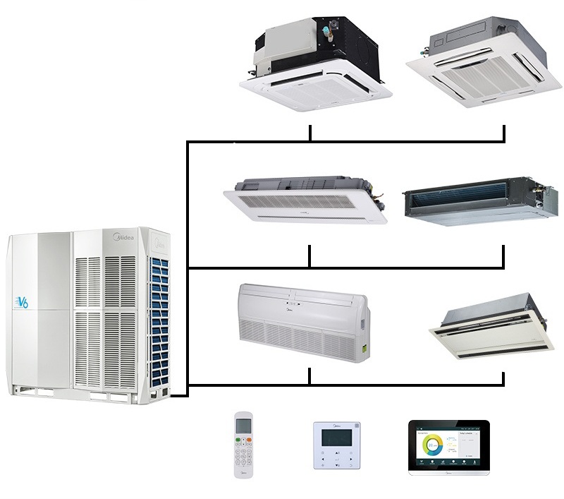 - کنترلر مرکزی: سیستمی برای کنترل کلیه یونیتهای داخلی و بررسی مصرف انرژی، برنامهریزی زمانی و تنظیمات فنی.
